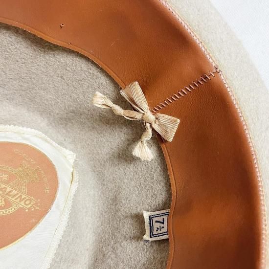 経年により若干グレーがかったベージュボディに、ブラウンの太幅リボン、パイピングなしのディテールとなっています。