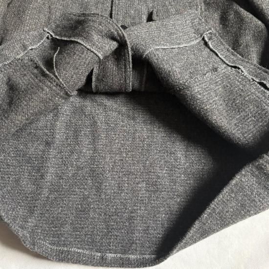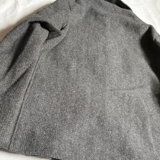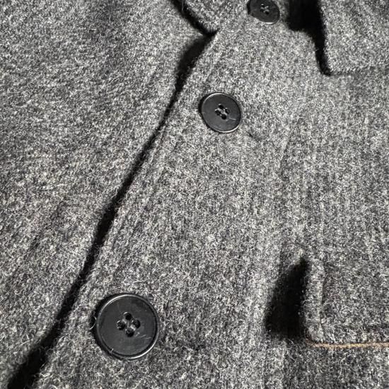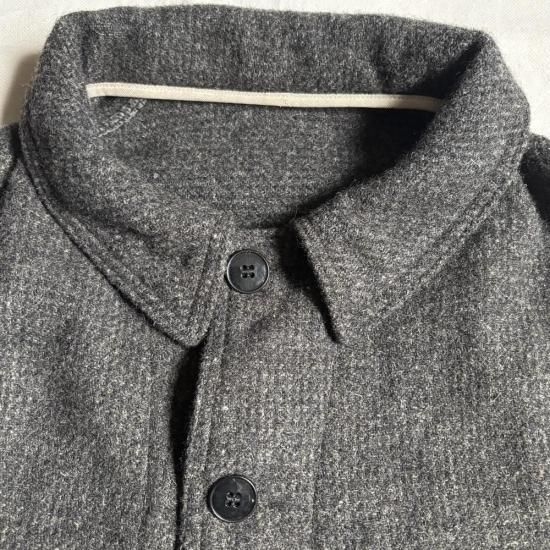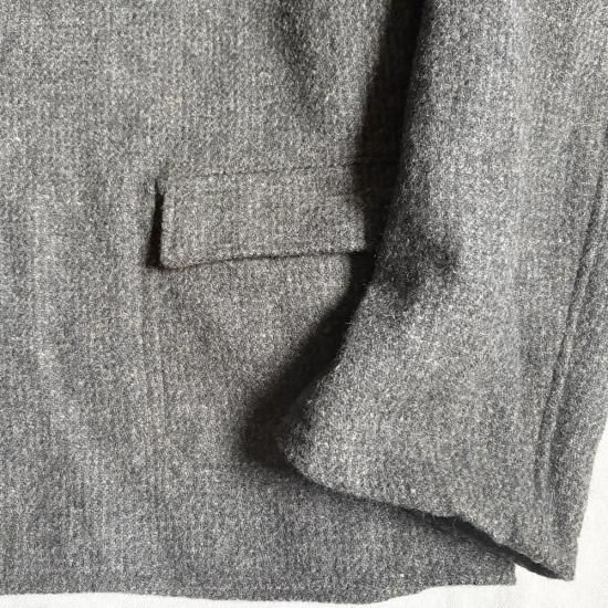 こちらは古い織り機ならではの、ごま塩風の独特の編み地が素晴らしいウールを採用。保温性に優れており、柔らかい質感ですが、ツイード素材に近い肉感です。チャコールグレーとブラックの糸が複雑に絡み合った、表情のあるごま塩柄が織り込まれた、雰囲気の良い仕上がりとなっています。